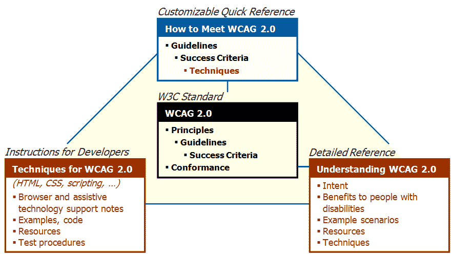The diagram below shows the different WCAG 2 documents for different purposes. It uses “WCAG 2.0” yet still applies for WCAG 2.1 and WCAG 2.2.
