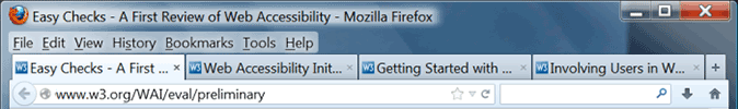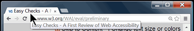 The image below shows the page title "Easy Checks - A First Review of Web Accessibility" in the title bar, and the titles of 4 pages in the tabs. Note that in the tabs, only the first part of the page title is shown.